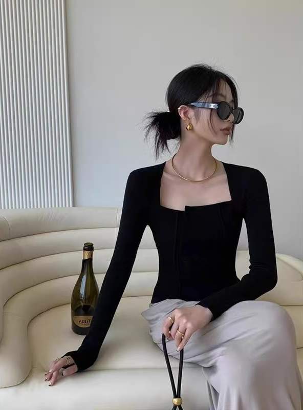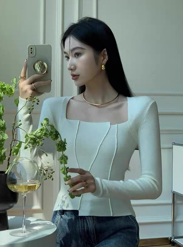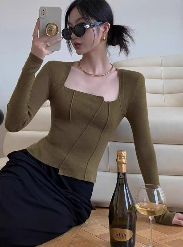 薄手のニットが身体の動きになじみ、スクエアネックの直線が顔まわりを静かに整えてくれます。